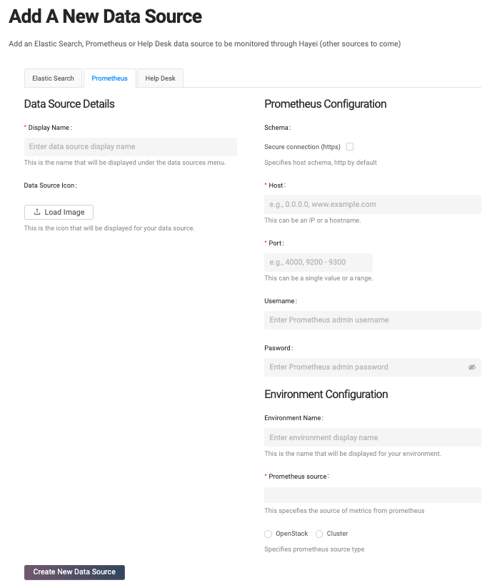 The final step is to set up an environment. A Prometheus installation can monitor multiple environments. Each environment has a unique index that is known as the Prometheus source. Internally, Prometheus can monitor the data center under the OpenStack type and monitor a Kubernetes Cluster (DeOS).