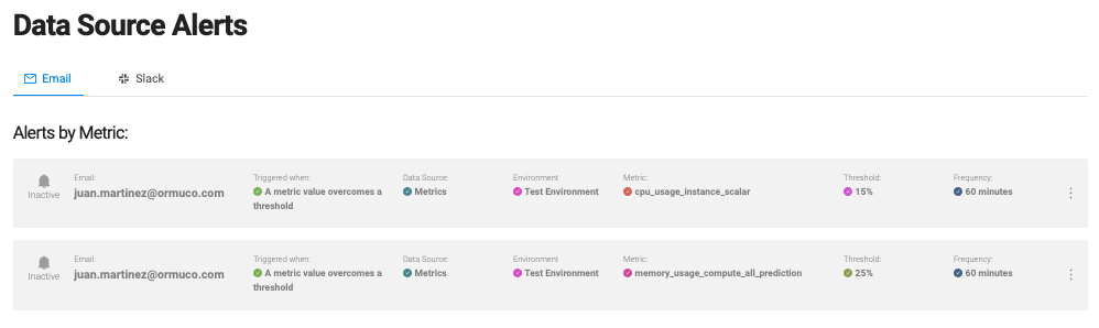 In one view, clients can see details about each alert, for example, who will receive the email alert when the metrics overcome a threshold, and the frequency of the notifications before the alert is off.