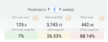 The default view for an OpenStack Cluster displays metrics for all servers. In this view, Hayei shows the CPU, the RAM Memory, and the Floating IP of the cluster. It also forecasts the usage of those metrics. By default, the metric values for CPU, RAM, and FIP are the average of the last 12 hours. The predictions are the values estimated for four weeks ahead. Both tables are updated each minute.