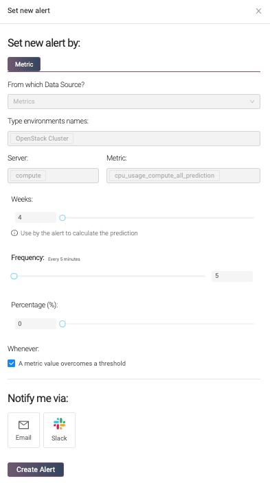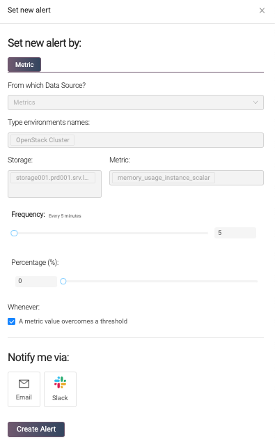 To make the creation of an alert easy, Hayei only requires a few fields. The frequency indicates how frequently Hayei notifies the receiver and avoids too many alert emails. The percentage is the threshold or set point that triggers the notification. Once the current value exceeds the threshold, Hayei would send an email (or Slack message) based on the frequency value. When the alert condition disappears, Hayei sends a notification for that. The last field is the email address (or the slack channel) for the receiver.